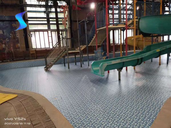 本項(xiàng)目位于北京市,為室內(nèi)水上樂(lè)園項(xiàng)目,原基礎(chǔ)為馬賽克瓷磚,局部有脫落、開(kāi)裂問(wèn)題,采用1.5mm泳池膠膜施工安裝,采用滿刮膠工藝熱熔焊接。施工安裝之前瓷磚損壞部分做找平處理,泳池膠膜施工安裝完畢后,整體比較平整、美觀。現(xiàn)場(chǎng)效果如下: