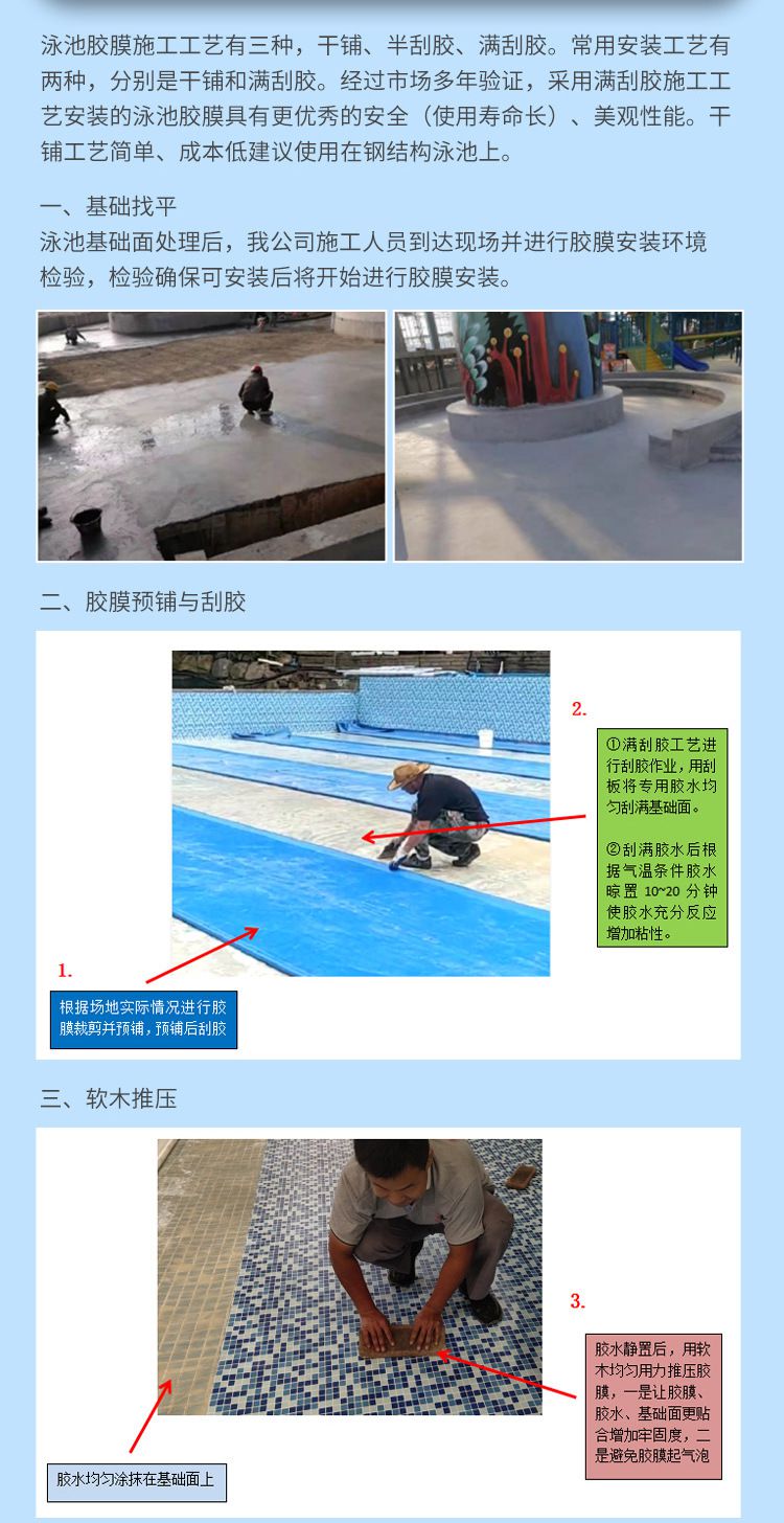 確實是這樣,安裝游泳池膠膜的工藝有多種,這個需要根據(jù)個人情況選擇,一分錢一分貨,要想做的效果更佳,那就需要多投入一點費用,總之這幾種工藝都可以,但是就安全牢固來講,推薦使用滿刮膠工藝。